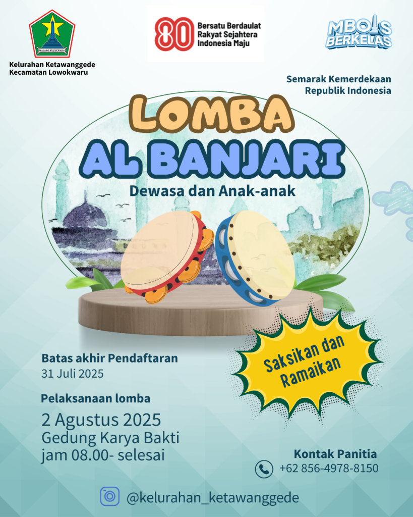 Geliat peringatan HUT Kemerdekaan Indonesia mulai terasa. Warga Ketawanggede kecamatan Lowokwaru Kota Malang antusias turut berpartisipasi merayakannya. Untuk pertama kalinya dalam sejarah kemasyarakatan di kampung Ketawanggede baru pada tahun 2025 ini. Diadakan Lomba Al Banjari tingkat kelurahan Ketawanggede pada Sabtu 2 Agustus 2025. Kegiatan yang mendukung Ngalam Asyik dan Ngalam Ngopeni pada program Walikota Malang 2025-2030.